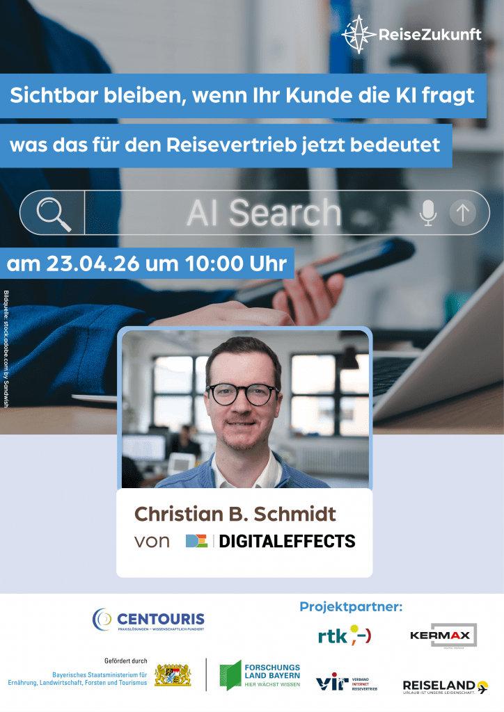 Du möchtest wissen, ob deine Website auch über KI gefunden wird? Dann melde dich jetzt für den kostenlosen Check an: https://digitaleffects.de/reisezukunft/. Im Webinar schauen wir uns ausgewählte Websites live an und zeigen konkrete Best Practices für mehr Sichtbarkeit in KI und Suche.